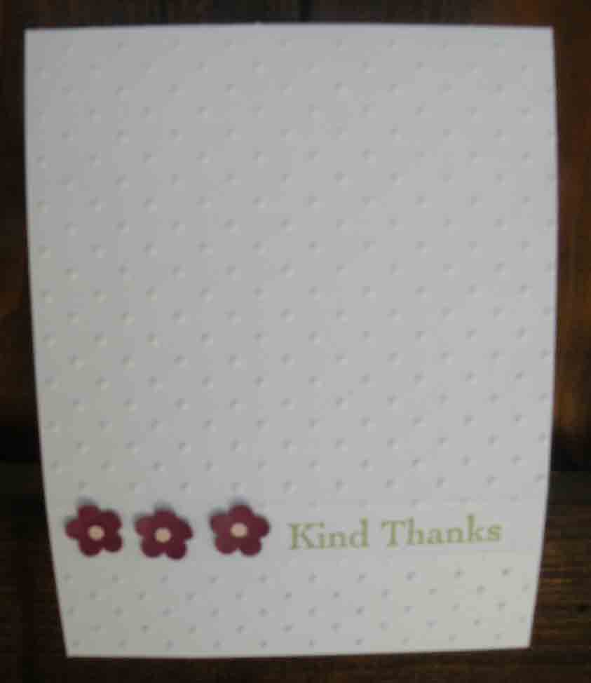 The stamp is from Thank You Kindly (111700) which is my go-to set for “thank you” sentiments these days and I stamped it in Pear Pizzazz (119784) classic ink on Whisper White card stock (100730). The punched flowers are from retired card stock and punch, but you could use whatever color appeals to you along with flowers from the Boho Blossoms punch (119858) or Itty Bitty Shapes Punch Pack (118309). You could also use our adorable flower buttons in the Designer Buttons packs found on page 197 of the 2011-2012 Idea Book & Catalog. Or maybe you have some prima flowers or other embellishments you’ve been meaning to use? The power of three rules here – just add three embellishments of your choosing.