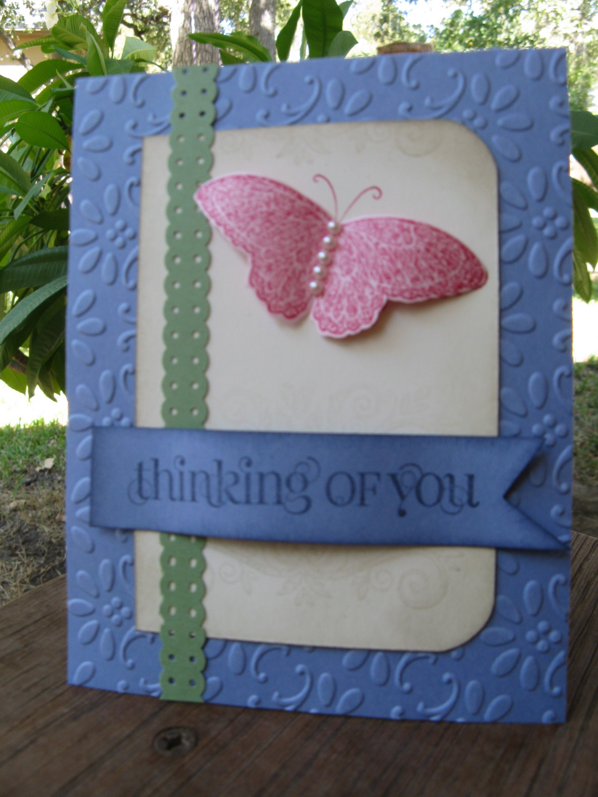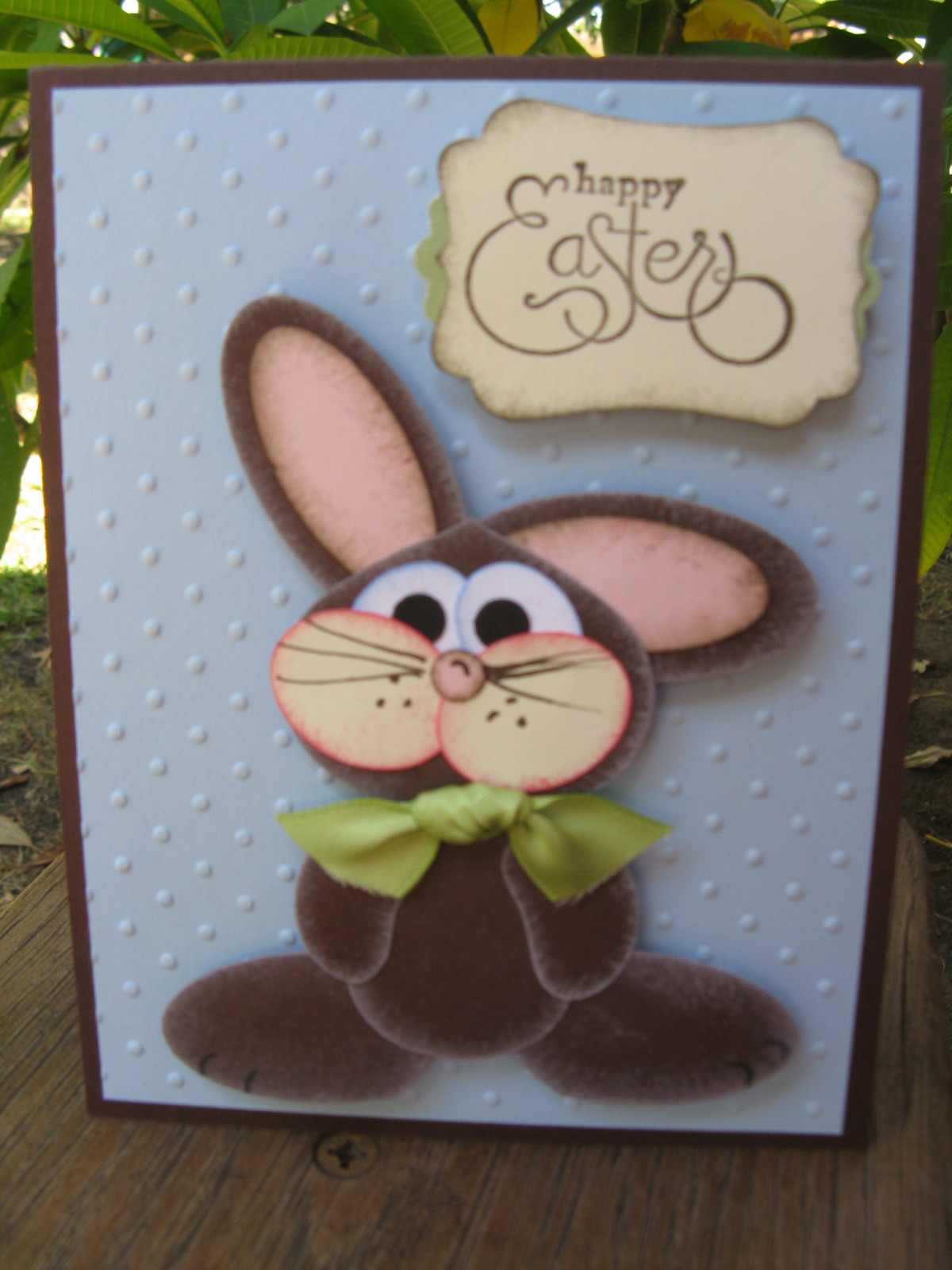 . Anyway, I came across this adorable punch art bunny on Kay Sha’s blog several months ago and just HAD to make a bunny right then. So I had a bunny leftover sitting on my desk. And I had the embossed background as well. And a tiny piece of satin ribbon. So I decided to use these leftovers and finish a card! What a concept, right? And since he is a bunny, I used an Easter sentiment from a retired stamp set on my shelf. Google Kay Sha to find her blog – she’s amazing! The bunny was created with numerous punches, mostly ovals, but also the owl and bird builder punches. Most of the pieces were sponged to help create depth and to make him look “furry.” Now I have an Easter card ready to go for next year. I still have more leftovers sitting on my desk – I’ll try to use them another day.