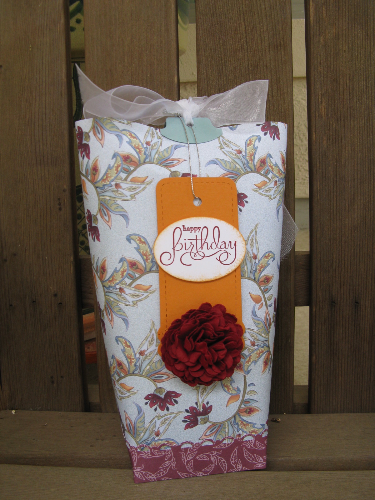 I needed to wrap a present this weekend so, of course, I decided to head to my craft area to see what I could create. I needed a small container and last week I saw a YouTube video from Wunsapona Time about a bag in a box that looked about the right size. So I found some pretty pattern paper and got started. This is the final result:
